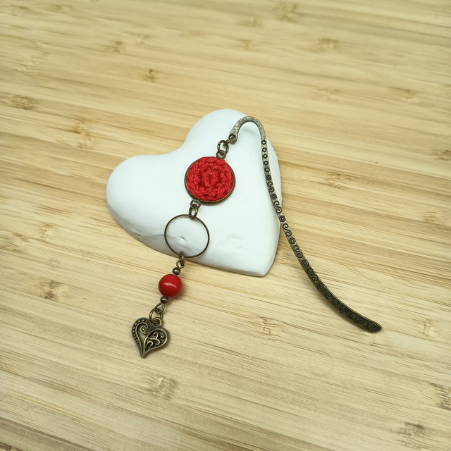 Ce joli marque-pages est réalisé à partir d'un disque de coton rouge vif crocheté à la main par mes soins puis inséré dans un suppot pour cabochon en métal de couleur bronze. J'y ai ajouté un délicat anneau métallique, une perle en jade teintée et une petite breloque en métal de couleur bronze en forme de cœur.