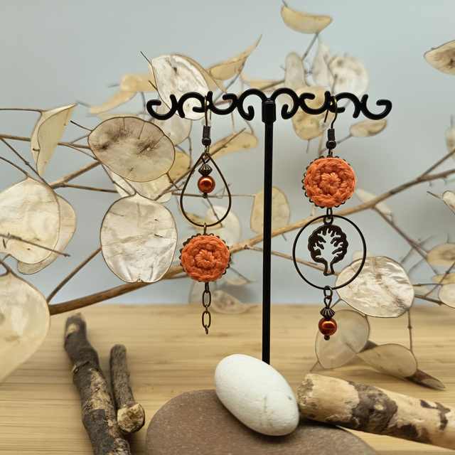 Elles ont été créées à partir de perles en verre et en métal de couleur bronze sans plomb, sans nickel et sans cadmium, de petits disques de coton Oeko-Tex crocheté à la main par mes soins et fixés sur de fines estampes en laiton. On y retrouve également l'arbre de vie présent sur le bracelet de cette parure. Elles sont asymétriques ce qui ajoute une touche de fantaisie à cette paire originale.