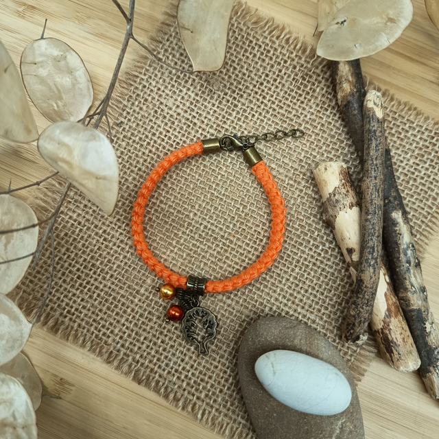 Ce joli bracelet original peut être porté seul ou avec une ou plusieurs des autres pièces de la parure orange et bronze 3, bâtie autour du sautoir Naissance d'une Fleur.